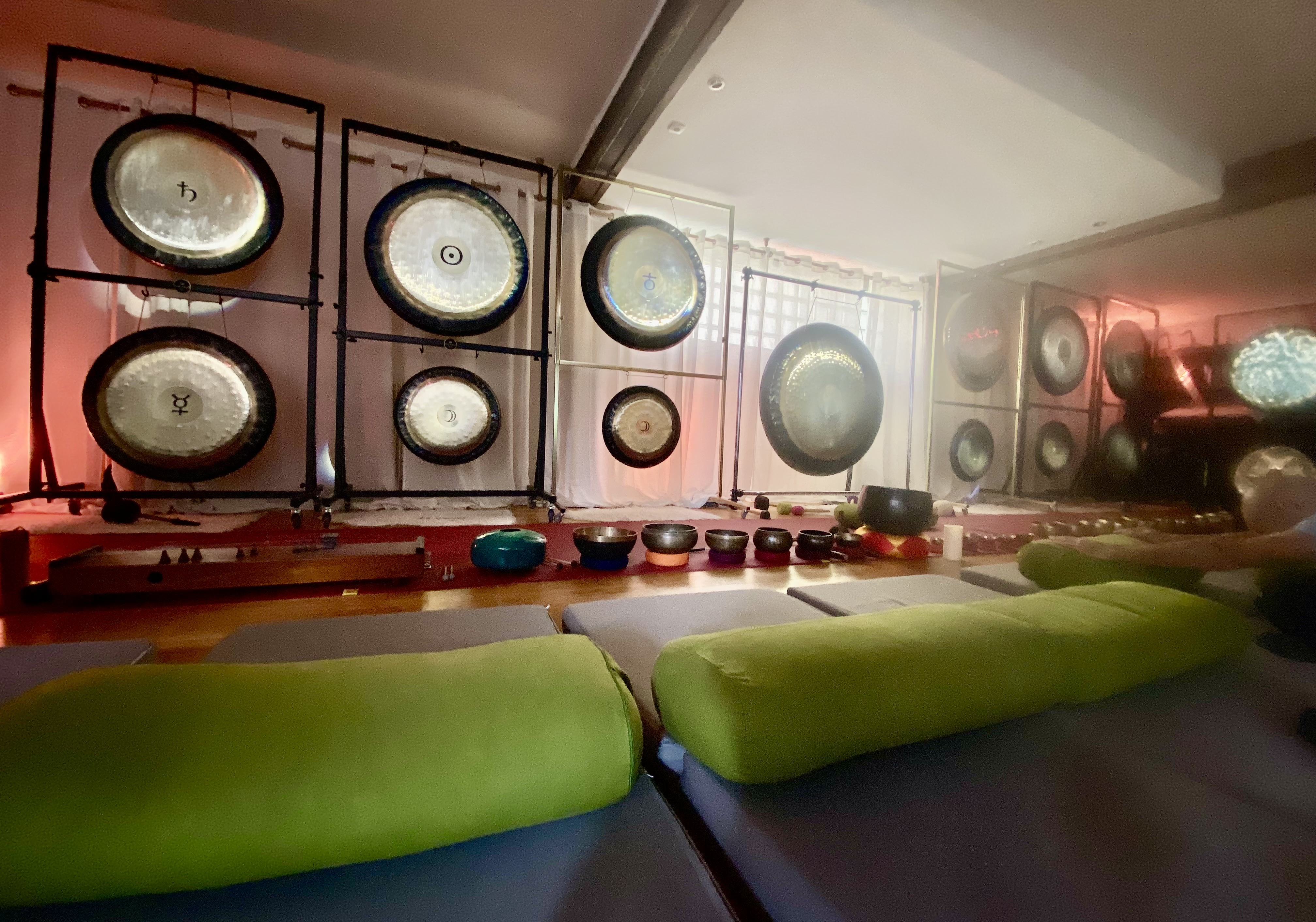 จุดเด่นในคลาสนี้คือการใช้ Gong ขนาดยักษ์ 50นิ้ว ในการกระจายพลังร่วมกับ Gong ใบอื่นๆอีกเกือบ 20 ใบ ขันทิเบต คริสตัลโบว์ Kochi chime, Rain maker และเครื่องดนตรีอีกหลายชนิดในการบำบัดผู้มาเยือนจากหลายประเทศทั่วทุกมุมโลกช่วงโควิด เรื่องตลกคือคนข้างๆไม่ใส่หน้ากาก และพูดเสียงดังเป็นภาษาฝรั่งเศสสำเนียงใต้ว่า ถึงเชื้อโรคจะลอยอยู่ในอากาศก็ตาม แต่ถ้าเจอแรงสั่นสะเทือนระดับนี้ก็คงไม่รอดแน่ๆ สรุปจบทริปนี้ผู้เขียนก็ยังรอดปลอดภัยจากโควิดได้อีกสองปีต่อมา